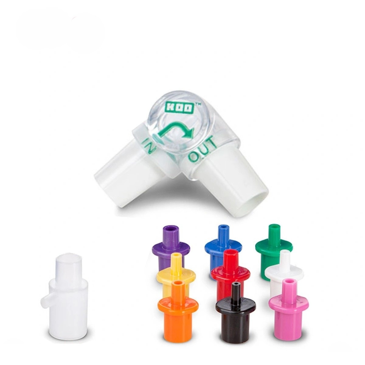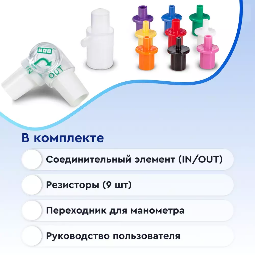 Дыхательный тренажер PipeP для упражнений на вдохе (IMT) и выдохе (PEP) от компании KOO Medical. Прибор оснащен одним главным разъемом, разъемом для манометра и 9 цветными резисторами разного диаметра. Устройство предназначено для использования одним пациентом.